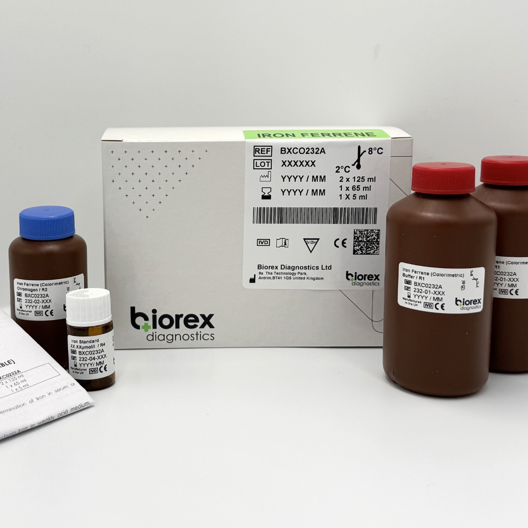 The Biorex Diagnostics Iron Assay is a ready-to-use test for the quantitative determination of iron in human serum and plasma, supporting the evaluation of iron status, anaemia, and iron-related metabolic conditions.