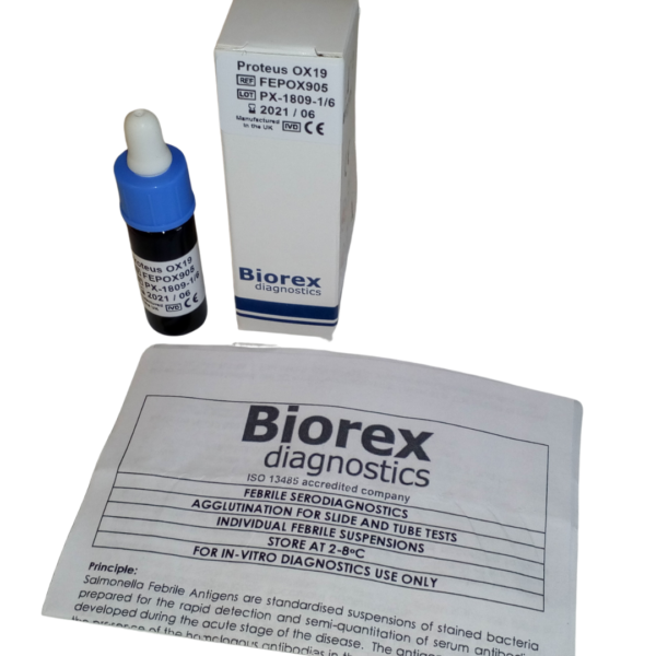 The Biorex Diagnostics Proteus OX19 stained febrile antigen suspension can be used to identify and quantitate specific antibodies in human sera following infection with certain Rickettsiae pathogens. Proteus OX19 reacts strongly with the sera of patients with typhus group rickettsae and rocky mountain of spotted fever.