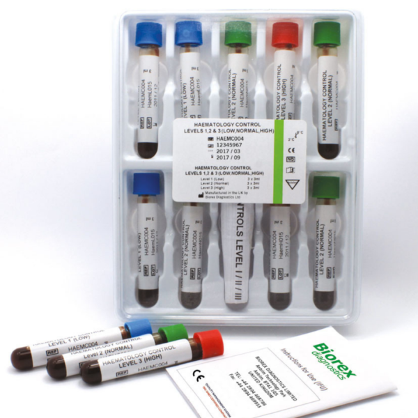 The Biorex Hematology Control (low, normal, high) kits are intended for use in monitoring the accuracy and precision of blood cell counts on haematology analysers.
